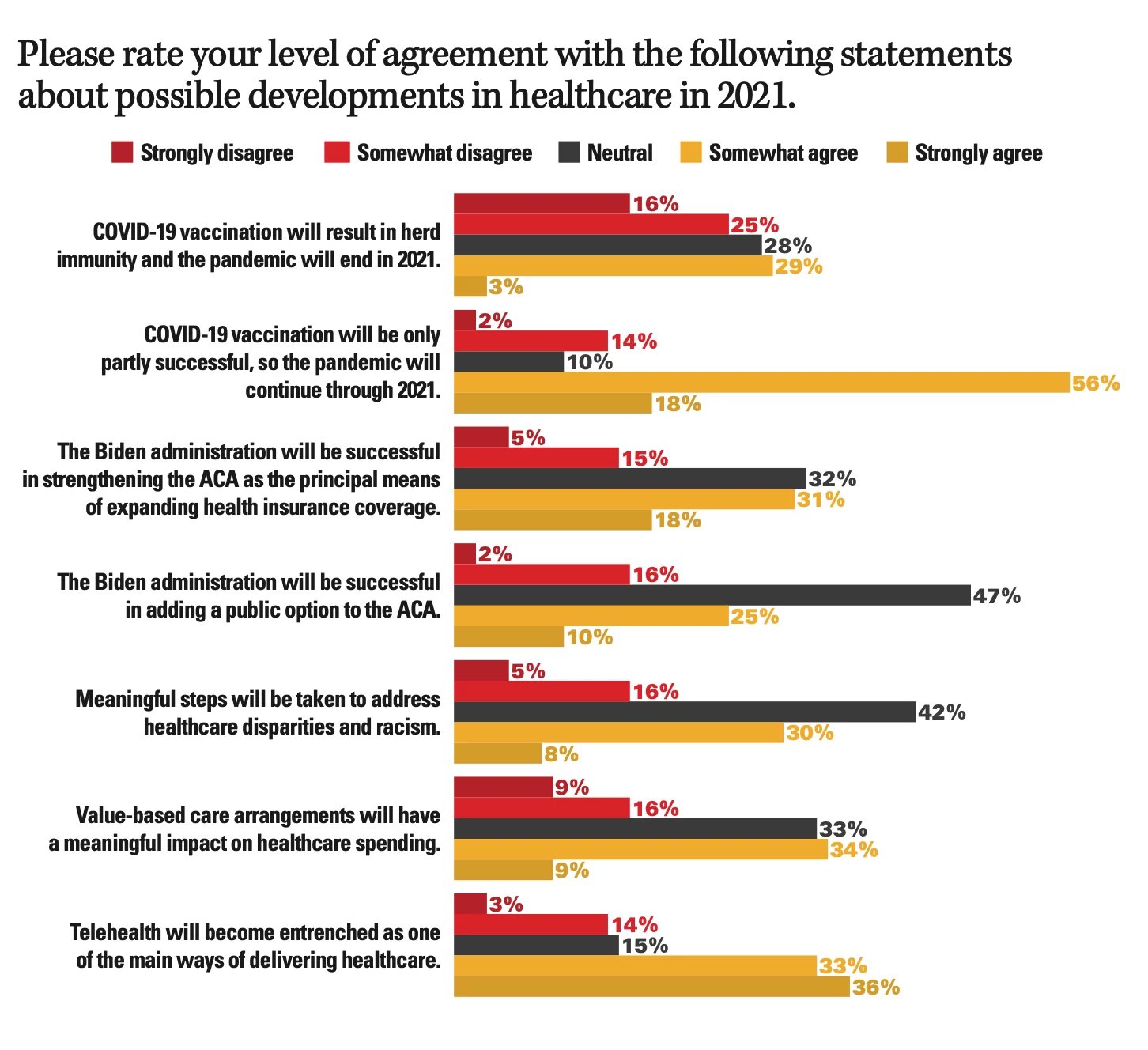 Managed Healthcare Executive: In a survey earlier this year, 101 healthcare executives shared their thinking about what lies ahead for their organizations and the industry in 2021. Managing challenges posed by COVID-19 transmission, responding to policy and regulatory shifts, and managing the shift to value-based care scored as their top three challenges.